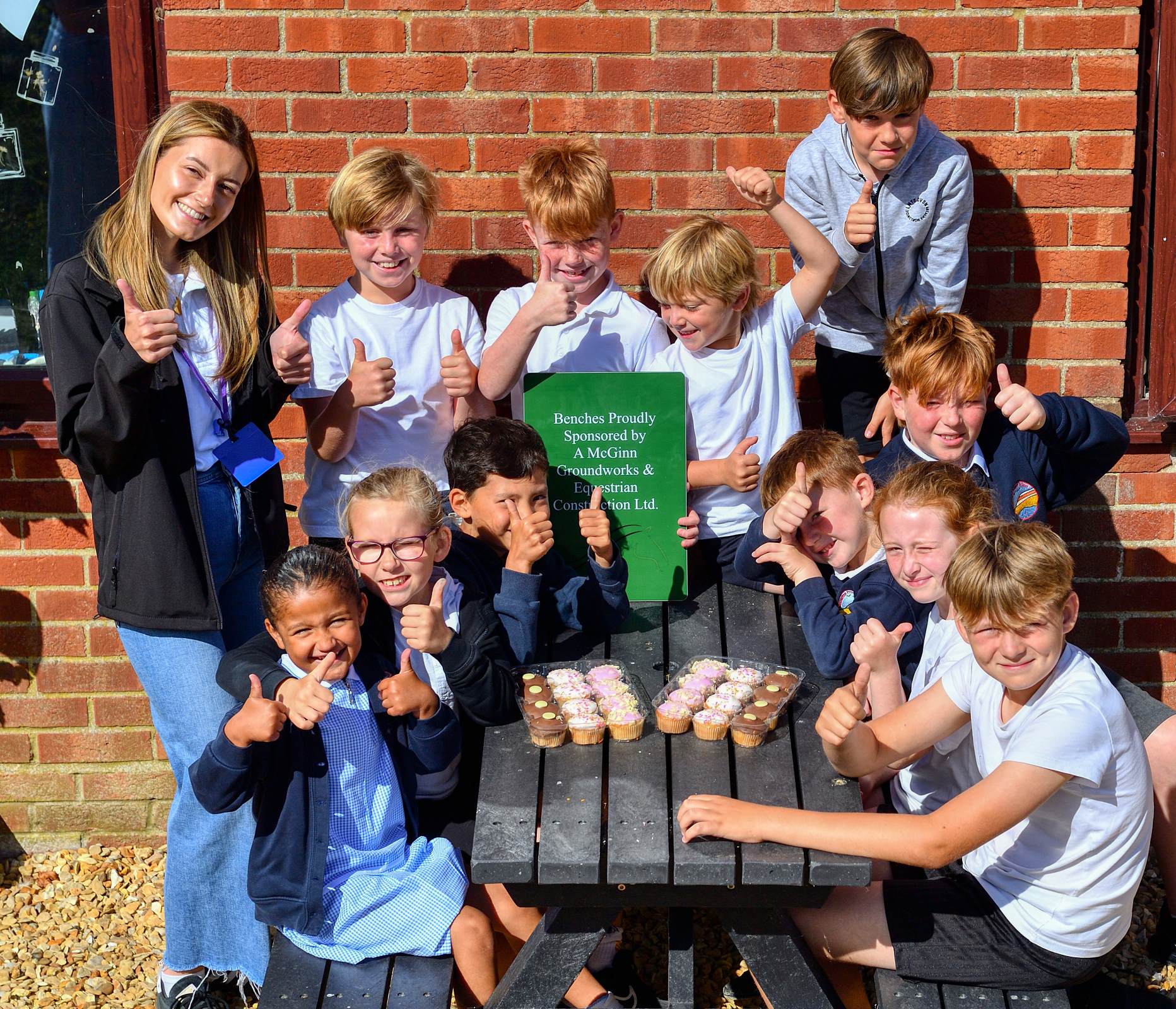 Children whose parents who had helped to transform the area then joined Miss McGinn for squash and cake on the benches and heard more about the work the company did and Miss McGinn’s own local education. Jon Butler Governor said ‘we were delighted when the company offered to purchase the benches, without support from the local community purchases like this, that enhance our children’s education are often not possible. It was also lovely to hear Miss McGinn’s own experiences in education and how successful she has been which was inspiring for the children’.